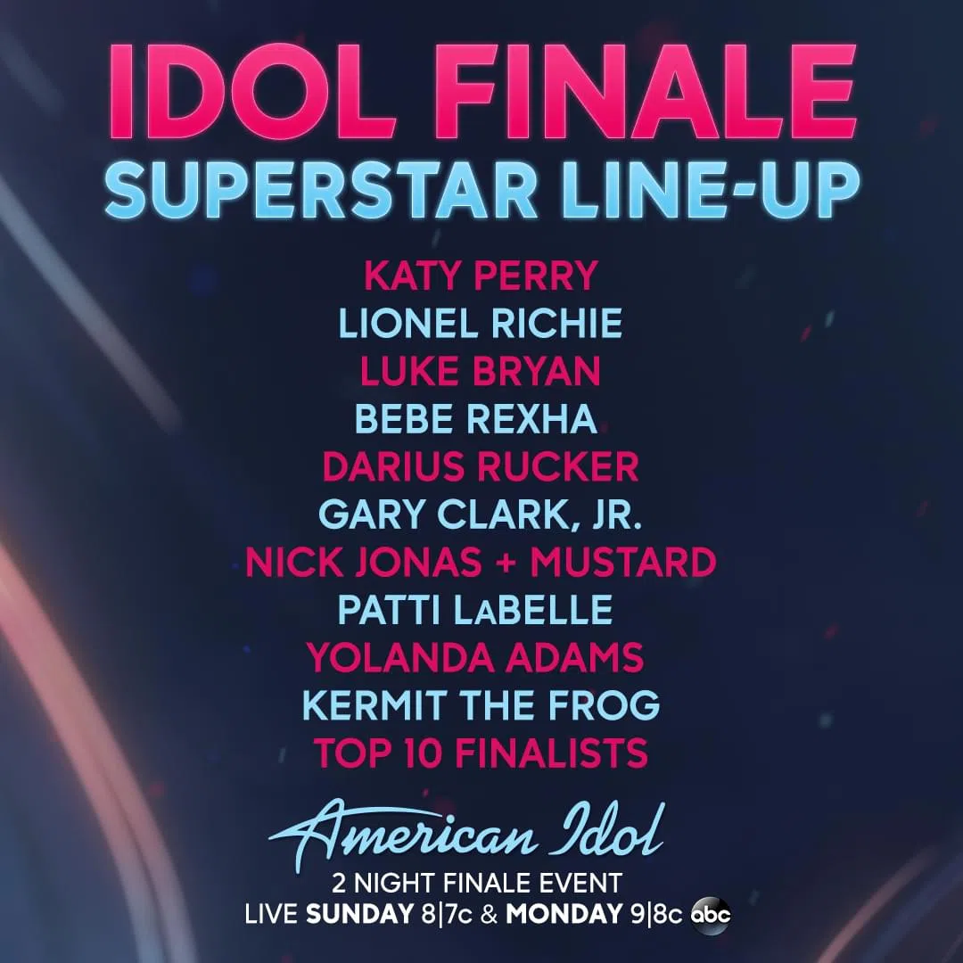 The two-night finale, which begins on May 20, will also feature performances by judges Luke Bryan, Katy Perry and Lionel Richie, as well as Bebe Rexha, Gary Clark Jr., Nick Jonas + Mustard, Patti LaBelle, Yolanda Adams, Kermit the Frog and the Top 10 Idol finalists.