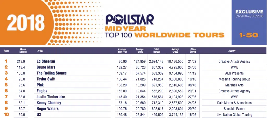 The list is based on how much money each tour has grossed from Jan. 1 to June 30, 2018, regardless of the number shows performed or ticket price. Kenny’s 25 gigs grossed $62.1 million, with the second lowest average ticket price—$87.18—in the Top 10.